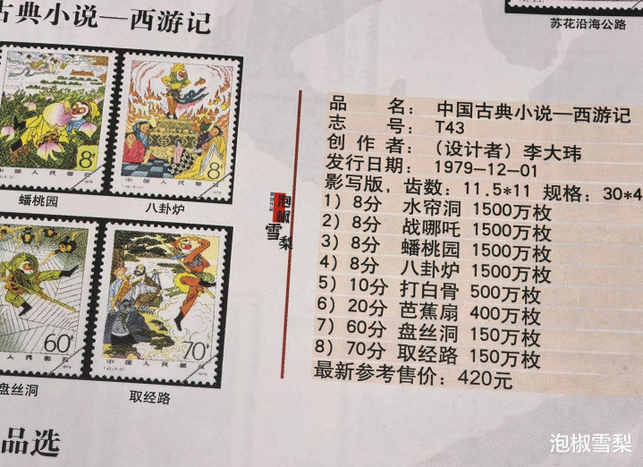 1979年T43《西游记》套票发行量为150万,1980年T54《荷花》套票发行量为100万,1981年T69《金陵十二钗》套票发行量则是304万,三套邮票中任意一套都要比猴票的发行量少,但它们的真实成交价格却远不及一枚猴票。